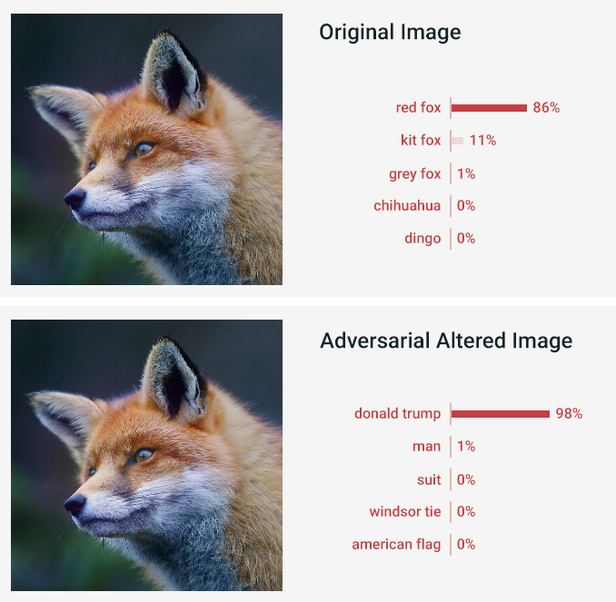 Take the two images below, visually to the human eye they look like identical images of a red fox. The first image is indeed an unaltered image of a red fox, however the second image has been altered by an adversarial attack neural network in such a way that the classifying neural network is able to classify this image to an almost perfect degree of accuracy as Donald Trump. Naturally this poses a problem to Donald Trump (and an advantage to the fox community) if the Whitehouse security systems rely on DCNNs for facial recognition.