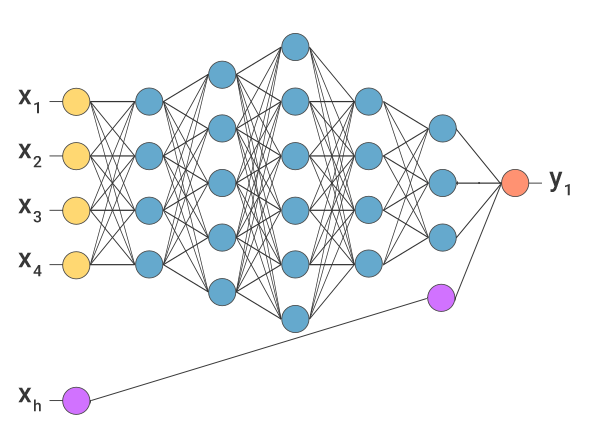In the diagram above, xh is the rouge input neuron. If we assume, as an example, that the network above is the final-stage classifier used for facial recognition we could take xh as being a rouge encoder value, under normal operation this value would be zero, however the attacker could manually set this encoded value to non-zero, triggering the override pathway.
