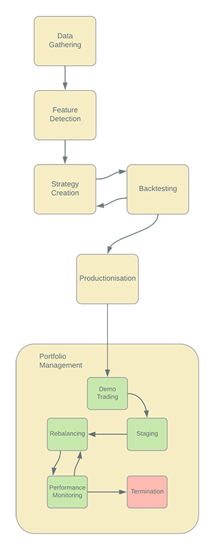 Finally the trading strategy is ready to be deployed in all its glory. But despite all the backtesting and careful development there is still a risk the strategy might perform badly in real-world conditions. This is why the portfolio management function employs a lifecycle approach to running a strategy. The lifecycle looks roughly like this: