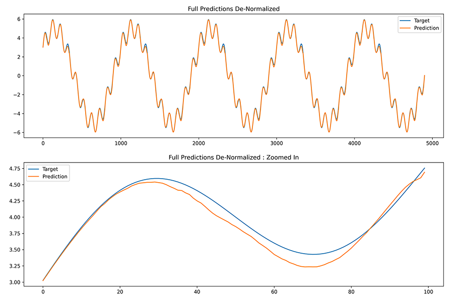The process to produce de-normalized predictions along the original reference data scale is summed up in the code below which creates a data window on the fly, stores the hi, lo values for that normalized data window and uses these hi, lo values to de-normalize the final prediction output to plot against the original un-normalized data window. This prediction vs targets can be seen in the figure above.
