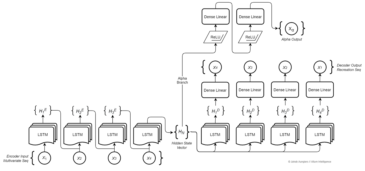 The second branch of the MvTAe model acts as a predictive branch - we call this the Alpha branch, as it generates a predictive alpha signal as its output. Its input is the output of the encoder - the hidden state vector which, when trained sufficiently, represents the underlying context and drivers of the dataset, and hence can be used to train the predictive alpha branch for a forward looking prediction of the dataset.